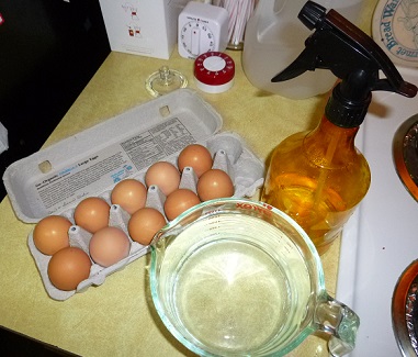“If you let the eggs sit out on the counter for a day or two, the little white parts of the egg white will absorb a little so your sprayer won’t clog as much.  When it does clog, just unscrew the spray head and pull out the lumpy egg white and continue. Be sure to mix the eggs well, before putting them in sprayer. Then add one gallon of water and spray.