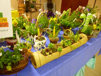 Garden Art: Flower Baskets Sedum/Succulent Terrariums & Pots – from $1 up! Check out the succulent arrangement inside a huge BAMBOO “pot”!