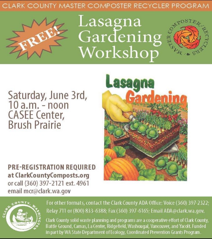 The Master Composter/Recyclers (MCR) of Clark County, WA, are holding a FREE class on how to make a raised bed in the “Lasagna Gardening” style.