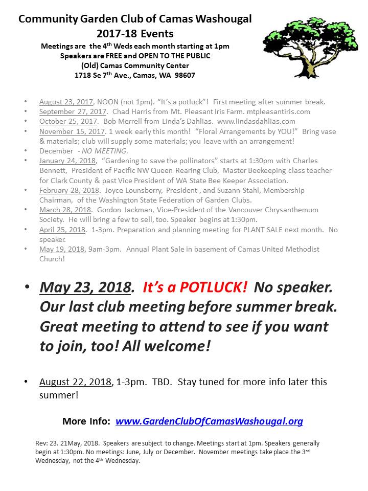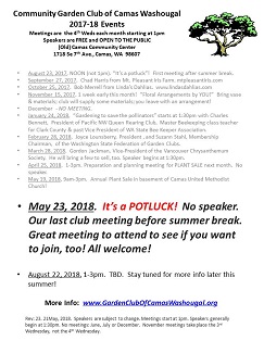 …is our last “general” club meeting taking place in the “old” Camas Community Center” before our “summer hiatus”. This is a great meeting to attend and see if you’d like to join – and if you want to join, you can do it at this meeting, too. Its a potluck! (Please arrive at 12:30pm to set up your dish!)