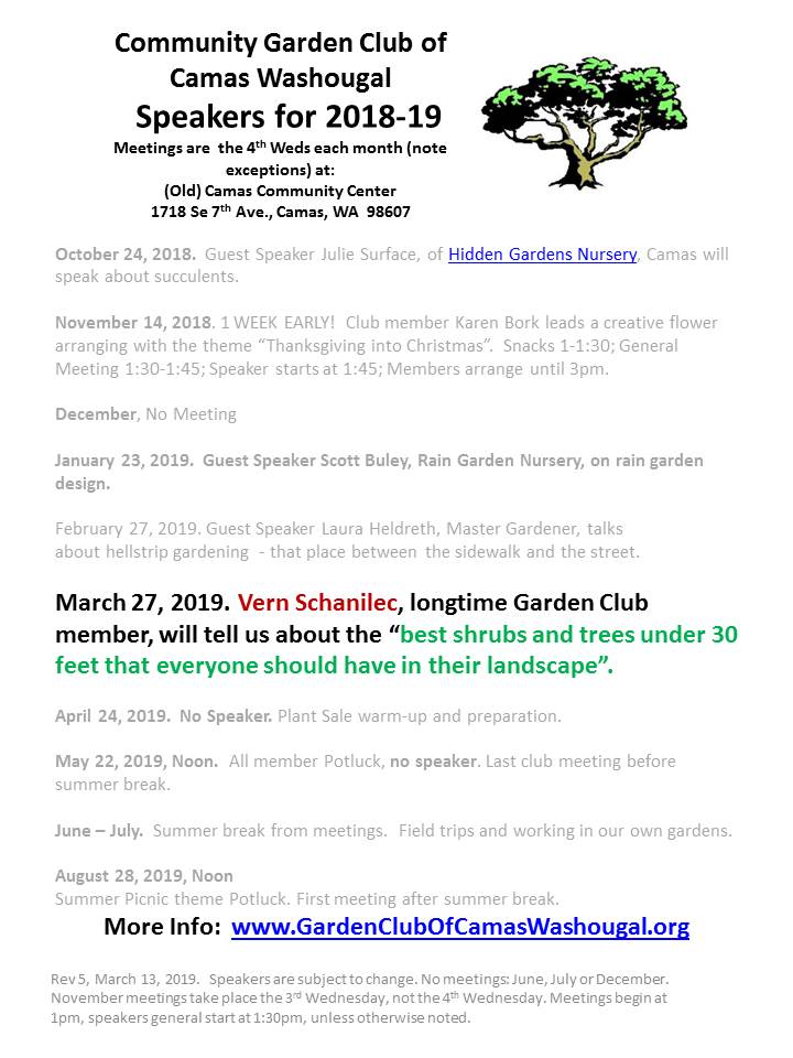 Here is the “Community Garden Club of Camas Washougal‘s” Speaker List for 2018-19 as of March 13, 2019.