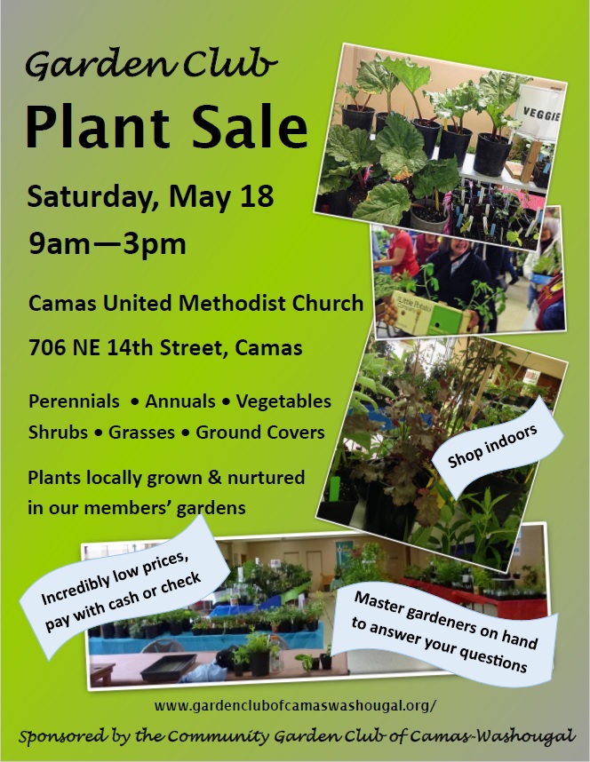For latest plant sale info, including “plant lists” and “specialty plants” we’ll be offering, check our Facebook page and our website Plant Sale section: https://gardenclubofcamaswashougal.org/plant-sale/