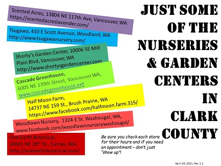 Know of other nurseries in Clark County? Let us know so we can share – GardenClubOfCamasWashougal@yahoo.com
