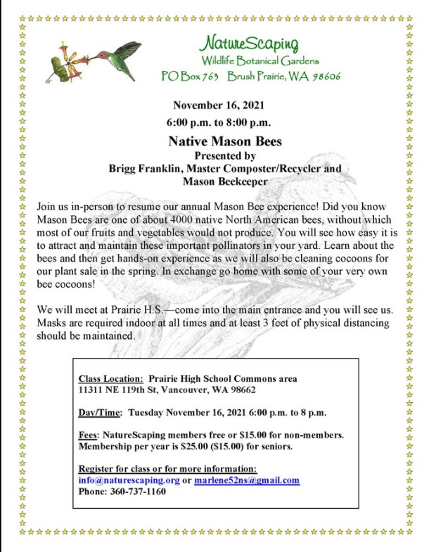 REGISTER and/or MORE INFO: info@naturescaping.org or marlene52ns@gmail.com or phone 360-737-1160.