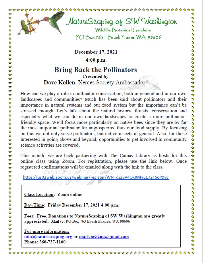 “Bring back the pollinators” – Naturescaping of SW Washington and the Camas Library co-sponsor this class.