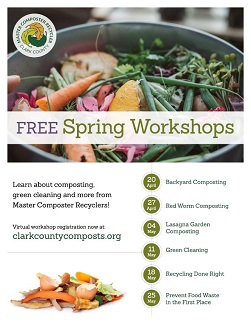 The “Clark County Master Composter Recyclers” (MCR) team has SIX FREE ZOOM (online) workshops – 3 on composting – coming up! Pre-registration is required.