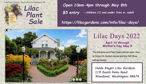 The Hulda Klager Lilac Gardens are back OPEN this year for their annual “Lilac Days” Plant Sale! Now through May 8th, 2022, 10am-4pm every day.