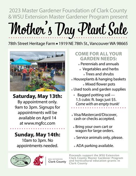 May 13th, Master Gardener Foundation of Clark County & WSU Extension Master Gardener Program Mother’s Day Plant Sale. 78th St Heritage Farm, 1919 NE 78th St. Vancouver, WA.
