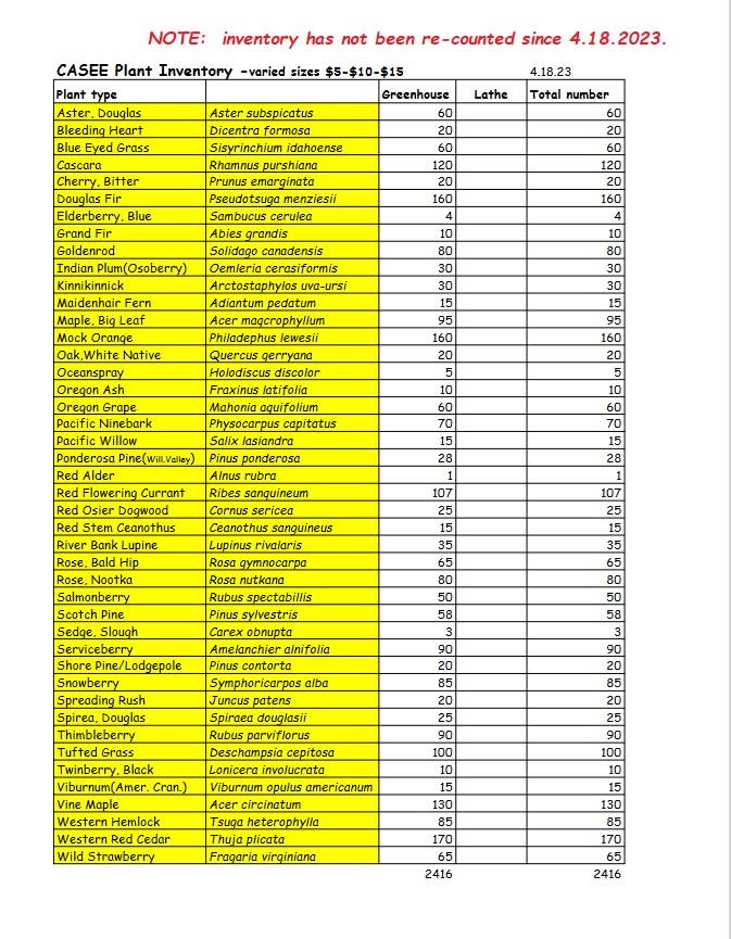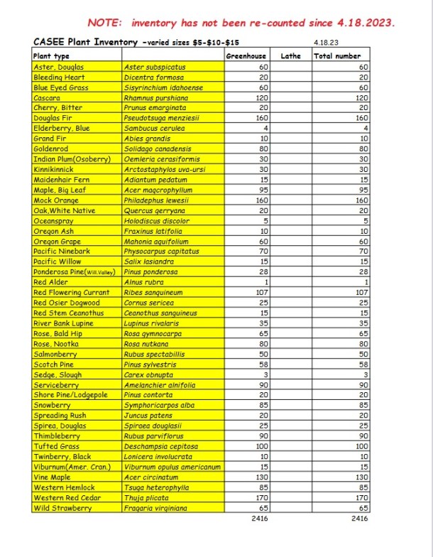 Inventory for CASEE is as of 4.18.2023 – but, good supplies of many plants still available in greenhouse.