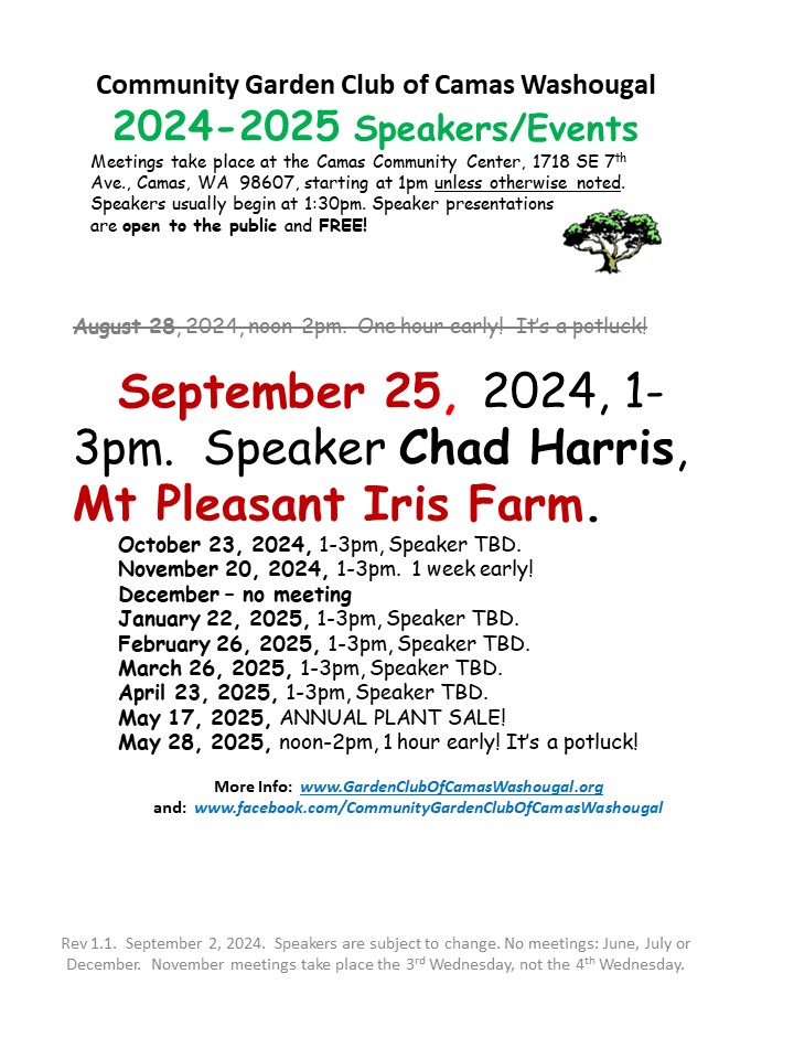 Our meetings are free and open to the public. Meetings, times, speakers and locations are subject to change. Unless otherwise noted, meetings generally begin at 1pm and TAKE PLACE in the Ballroom of the Camas Community Center, 1718 SE 7th Ave., Camas, WA 98607. (The PLANT SALE does NOT take place at this location!)