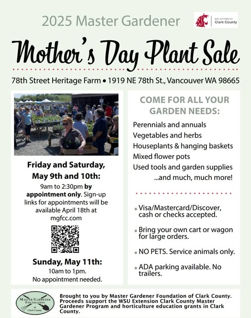 The annual “Mother’s Day Plant Sale” by the WSU Master Gardeners is May 9, 10 and 11! Sign ups are required for the 9th and 10th, but, not for the 11th.